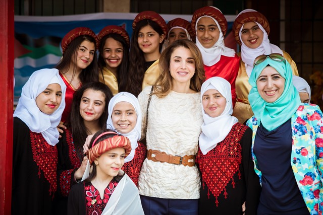 School Principal Maha Asfour joined Her Majesty while watching a performance by the Girl Scouts, and listening to students sing national songs. Queen Rania also toured an exhibition displaying mosaic, pottery, and woven handcrafts made by students participating in the 'Madrasati’ program, which is implemented by the ‘Madrasati’ initiative.