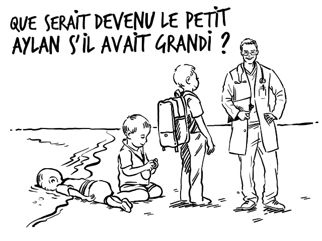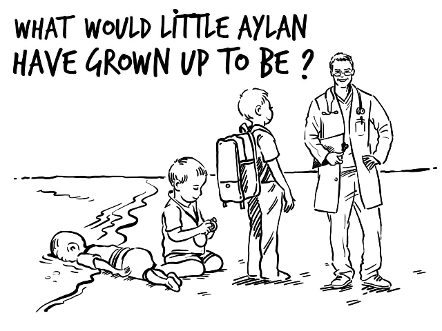 The cartoon is in response to French satirical magazine Charlie Hebdo's latest depiction of Aylan Kurdi, a three year old Syrian refugee, whose body washed up on Turkish shores last September after a desperate attempt to reach Greece by boat.