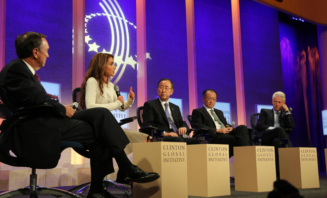 (Office of Her Majesty, Press Department- New York) – Her Majesty Queen Rania Al Abdullah joined UN Secretary-General Ban Ki-moon and World Bank President Jim Yong Kim at the opening of the eighth annual meeting of the Clinton Global Initiative (CGI) in New York on Sunday.