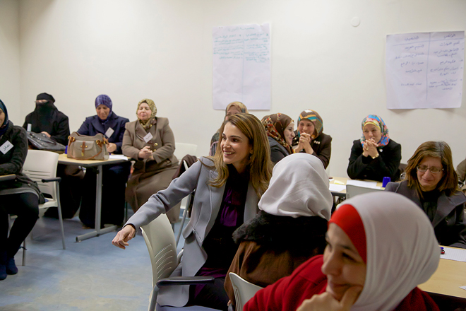 Queen Rania attended part of a session on "performance evaluation" which mostly included teachers from public schools and a few teachers from private schools. The Queen listened to trainees talk about the course and explain the skill sets they were hoping to acquire or improve through their attendance.