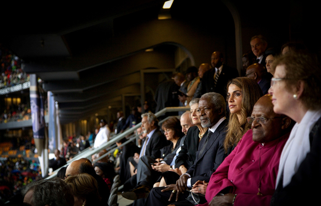 Queen Rania and Ensour joined over 90 world leaders including US President Barack Obama and former US Presidents Jimmy Carter, George W. Bush and Bill Clinton. South Africa's current President Zuma as well as other heads of states and leaders from across Europe, Asia and the Arab world also attended the service.