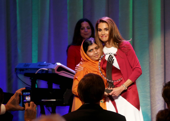 Queen Rania introduced Malala and explained that her story is a lesson in how one young girl can inspire a global movement to create positive change. Her Majesty also praised Malala for her will to survive and her amazing efforts in advocating for children's rights to education, especially girls.