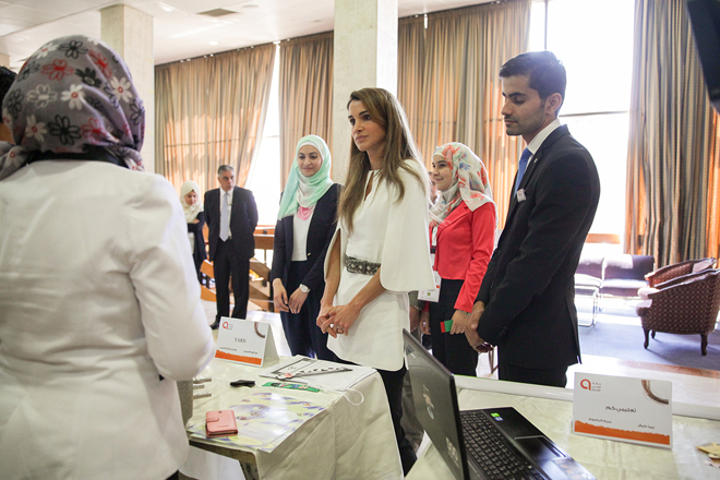 On the day of the competition, which Queen Rania dropped in on today, qualified students replicate the process of starting businesses in the real world. They register their ideas at a virtual Ministry of Industry and Trade, deposit their money at a virtual bank, exhibit their ideas, and present their projects to different investors.