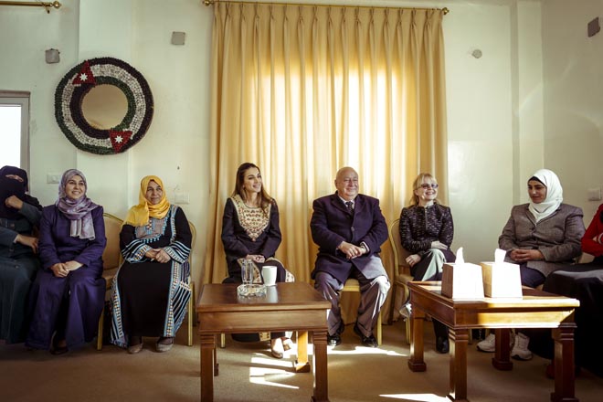 Her Majesty also toured a handmade artwork and accessories workshop for local women trained by Kais Karadsheh, owner of KK Handmade Artwork and Accessories. Karadsheh explained that the products were sold in several fairs in Amman and have generated extra income for the women. Mohamad Qudah, a student and one of the beneficiaries, explained that the training polished his skills and helped him earn extra income.