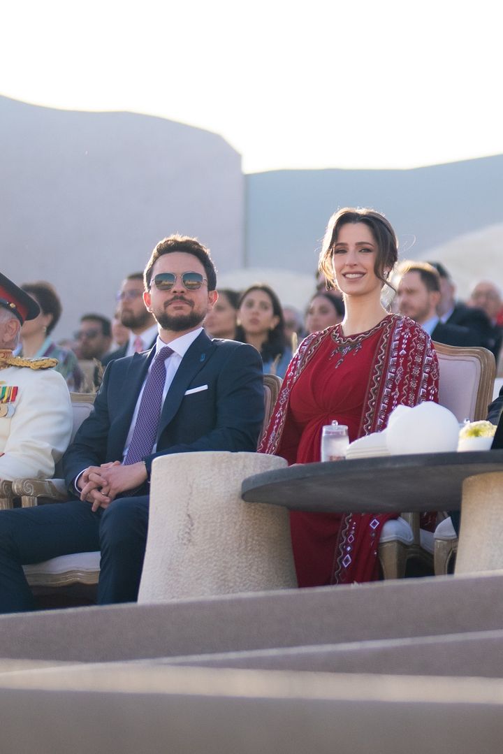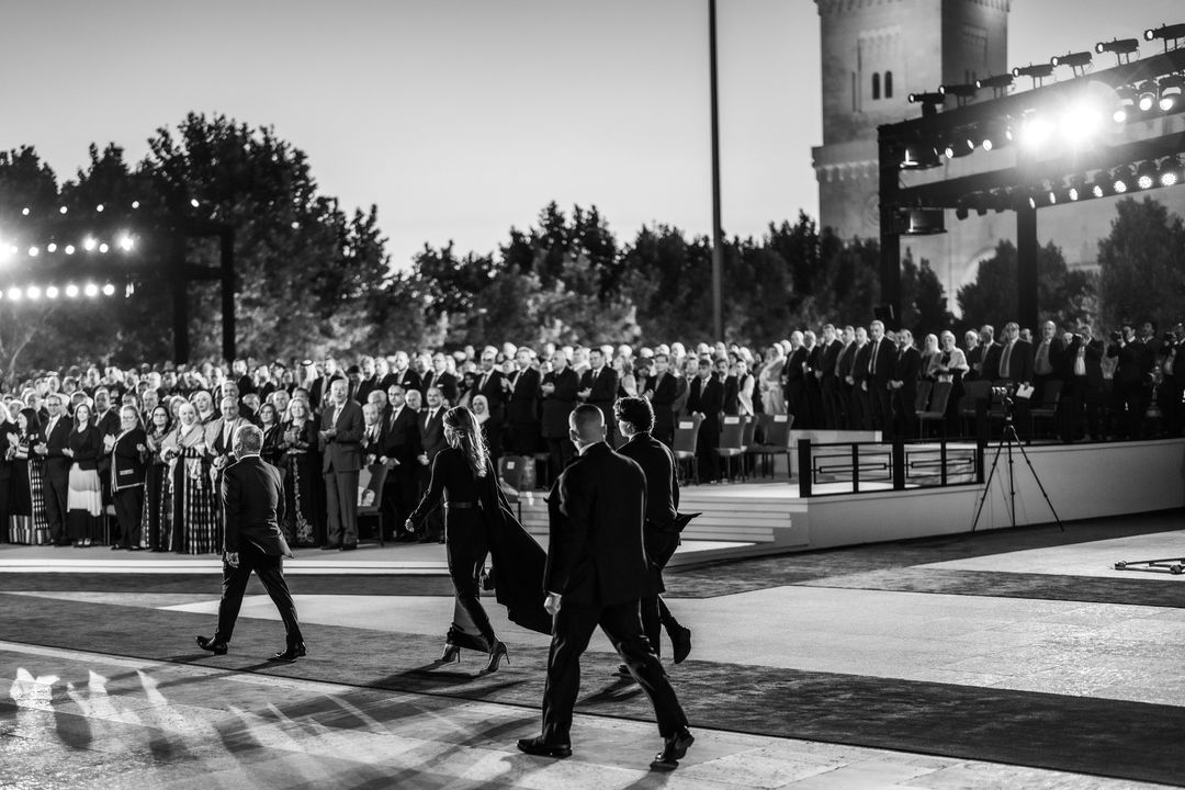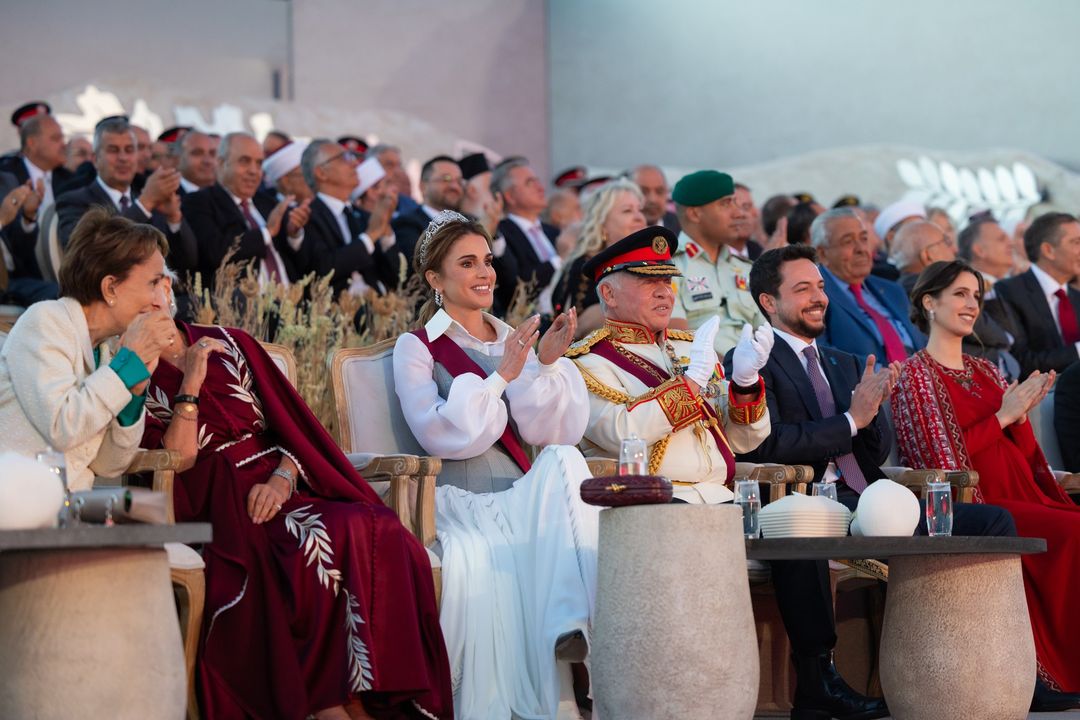 جلالة الملك عبدالله الثاني وجلالة الملكة رانيا وسمو الأمير الحسين ولي العهد خلال الفعالية الوطنية بمناسبة اليوبيل الفضي لتولي جلالة الملك عبدالله الثاني سلطاته الدستورية