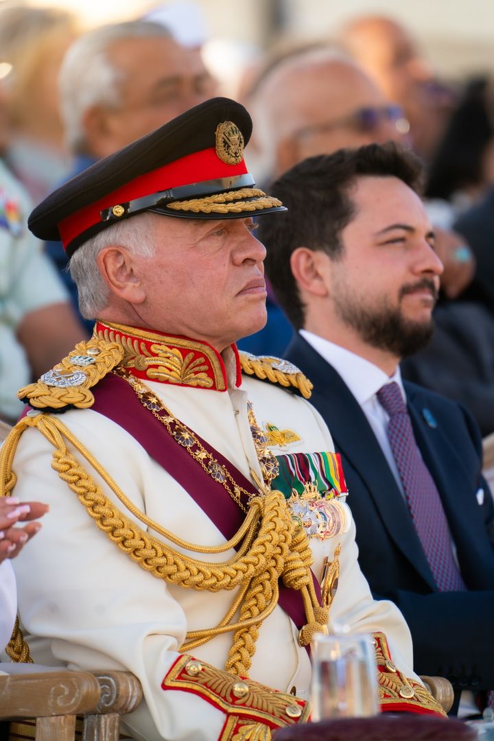 جلالتا الملك عبدالله الثاني والملكة رانيا وسمو الأمير هاشم خلال احتفال عيد الاستقلال الثامن والسبعين للأردن