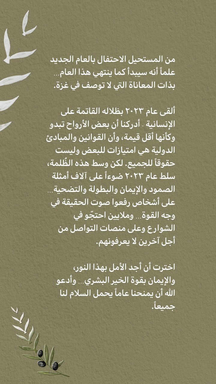 لقد أكرمني الله حين كَتب لي أن أقضي حياتي معك، أن أكون أم أولادك ورفيقة دربك يا أعظم الرجال وأنبلهم. قائد جريء في طموحه للوطن، راسخة مبادئه، ثابتة مواقفه، وملهم إيمانه بالأمل.