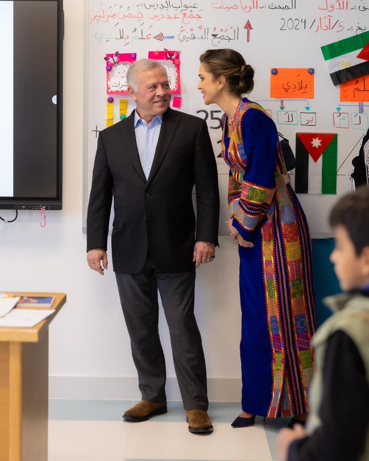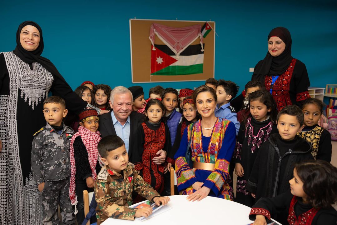 جلالة الملك عبدالله الثاني وجلالة الملكة رانيا خلال زيارة إلى محافظة اربد وافتتاح المبنى الجديد لمدرسة إبدر الثانوية الشاملة المختلطة ضمن احتفالات المملكة باليوبيل الفضي لتسلم جلالة الملك سلطاته الدستورية وجلوسه على العرش