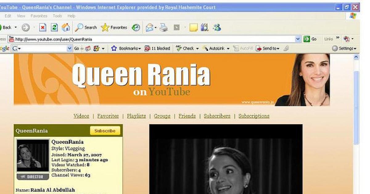 Queen Rania's official YouTube page Amman, Jordan / March 31, 2008 صفحة جلالة الملكة رانيا الرسمية على موقع يوتيوب عمان, الاردن / 31 آذار 2008 © Royal Hashemite Court Social Media Source Flickr