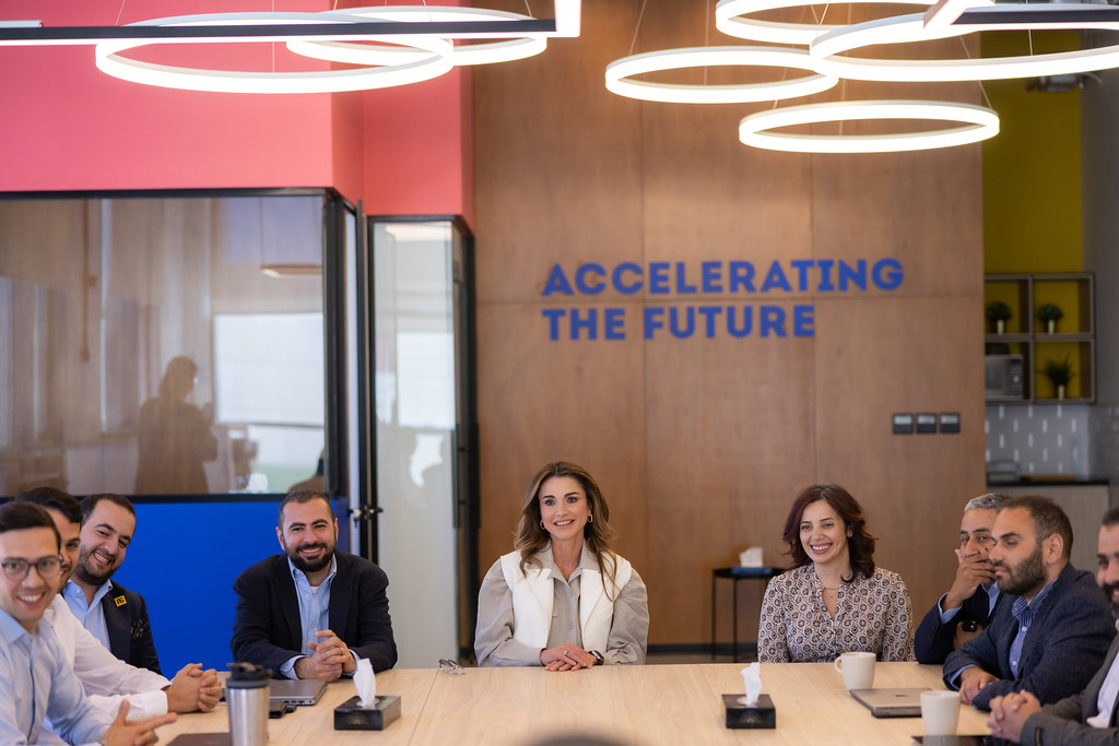 الملكة رانيا خلال زيارة إلى مكاتب Flat6Labs الأردن
