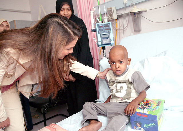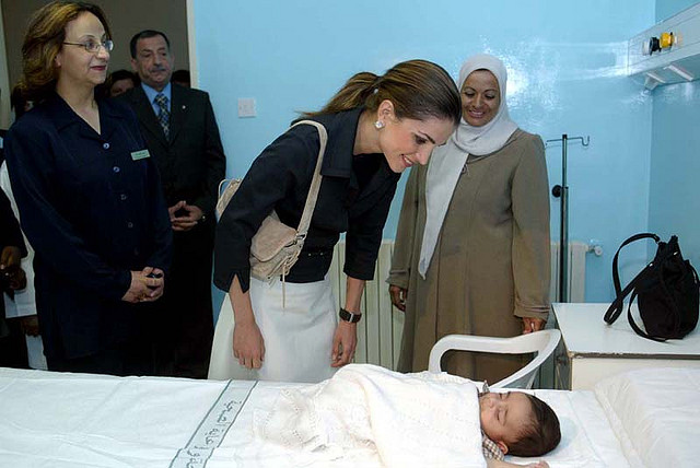 خلال زيارة الى مستشفى اليرموك حيث افتتحت جلالتها مبنى المستشفى الذي بلغت كلفة إنشائه تسعة ملايين دينار ويقدم خدماته لحوالي 100 آلف مواطن من أبناء اللواء والمناطق القريبة