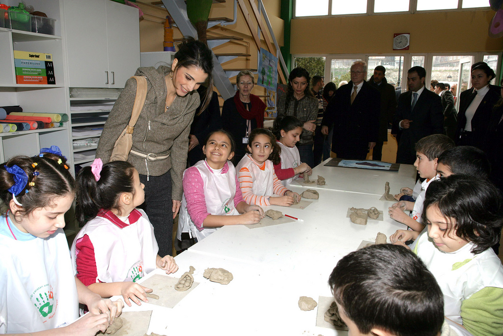 A group of children greet Queen Rania upon her arrival at one of the programs of the Turkish Mother Child Education Foundation.