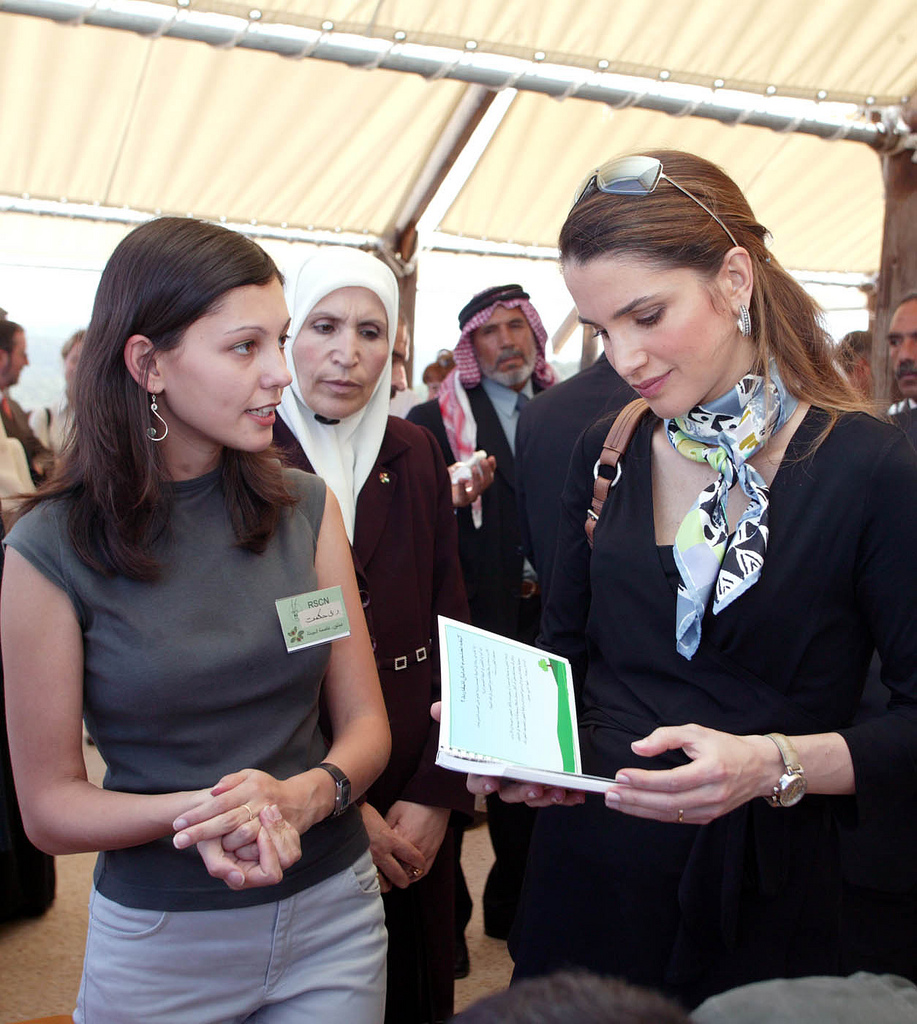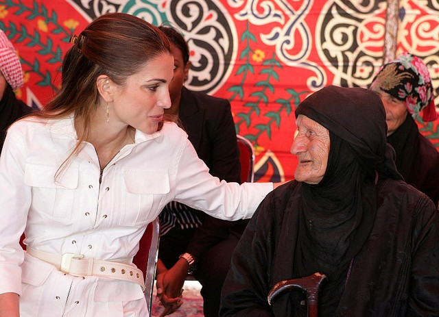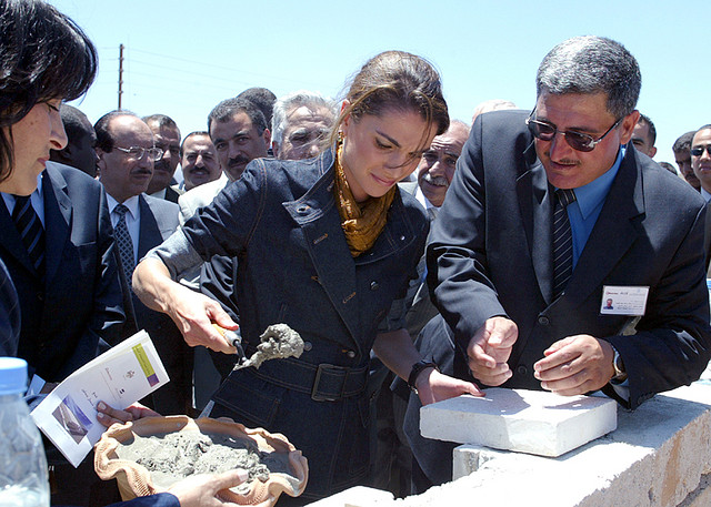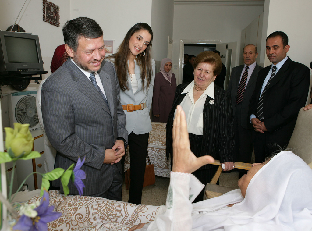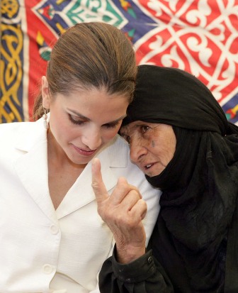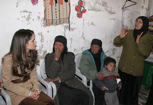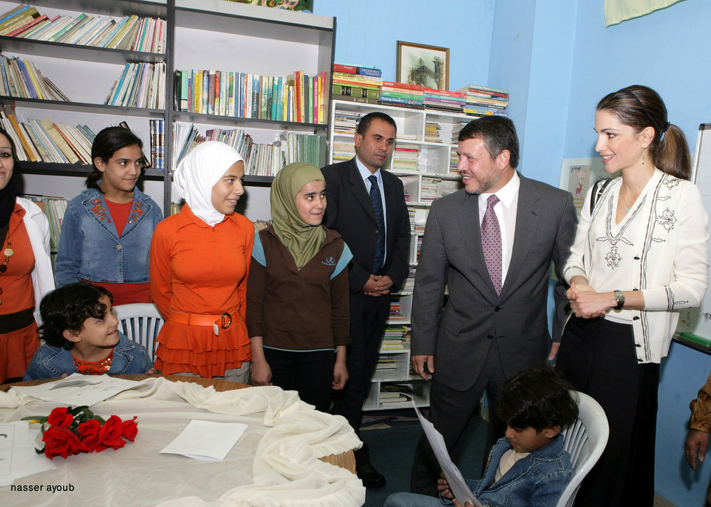Joins a group of local women from Al Manshieh Village for a frank conversation about the circumstances in their area. Her Majesty, accompanied by Saad Nasir, CEO of Fastlink, visited the village to reinforce the need for the involvement of the private sector in improving the living conditions.