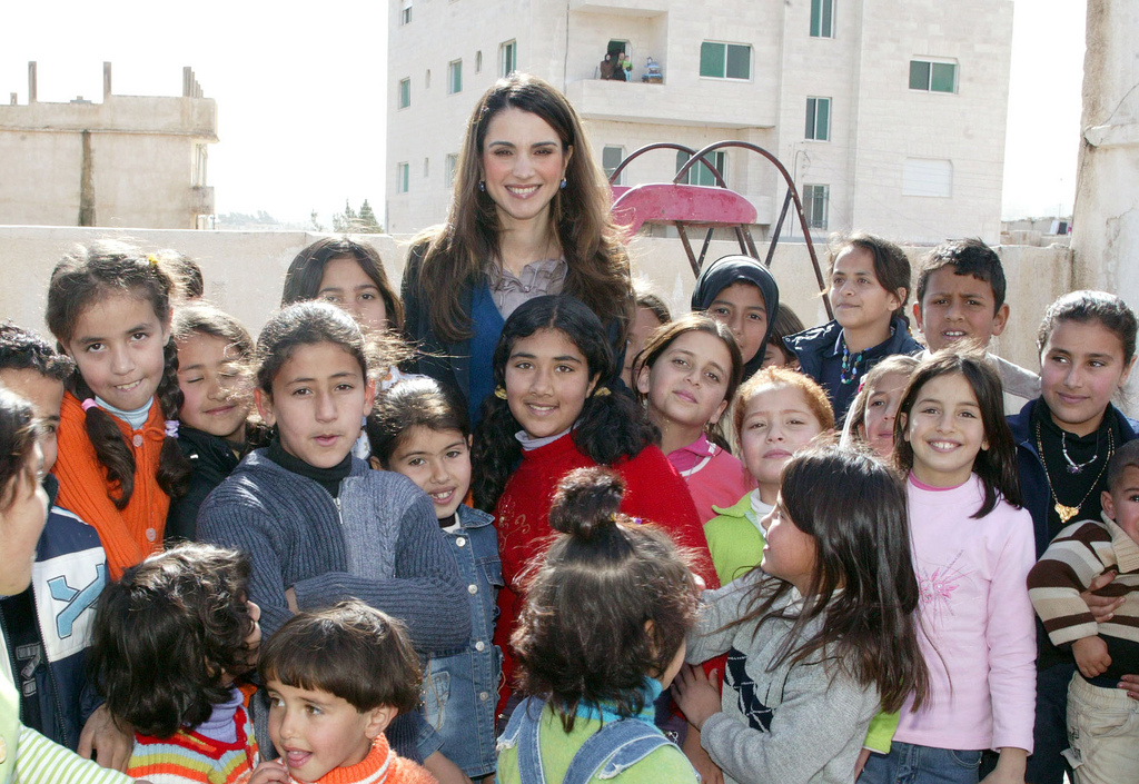 مع اطفال من منطقة شفابدران خلال زيارة للمنطقة حيث التقت جلالتها مع سكان المنطقة واستمعت الى احتياجاتهم