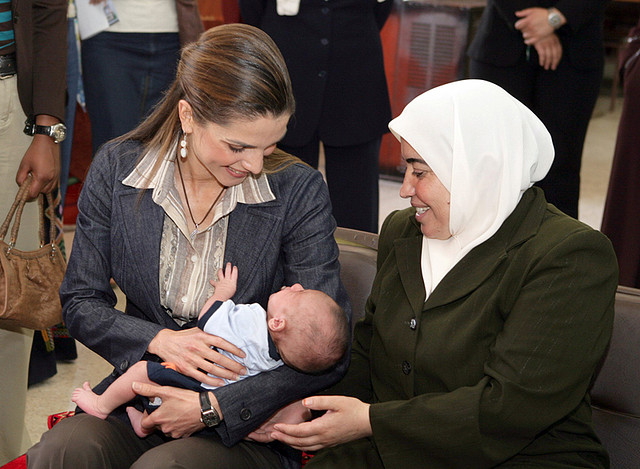 Holds a baby during her visit to the Jerash Women's Society, the most active community based organization in the governorate.