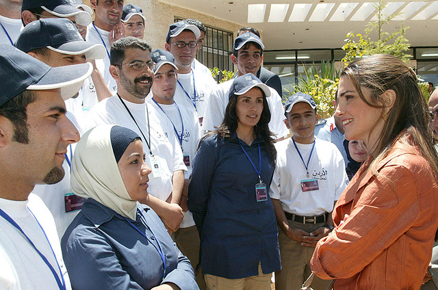 تتحدث الى مجموعة من الشباب والشابات من طلاب معهد الملكة رانيا للسياحة والتراث في الجامعة الهاشمية خلال زيارة لجلالتها لحدود جابر والعمري حيث شاركت جلالتها الطلاب باستقبال الزوار القادمين للاردن وأطلقت جلالتها برنامج التعاون بين هيئة تنشيط السياحة والجامعة الهاشمية