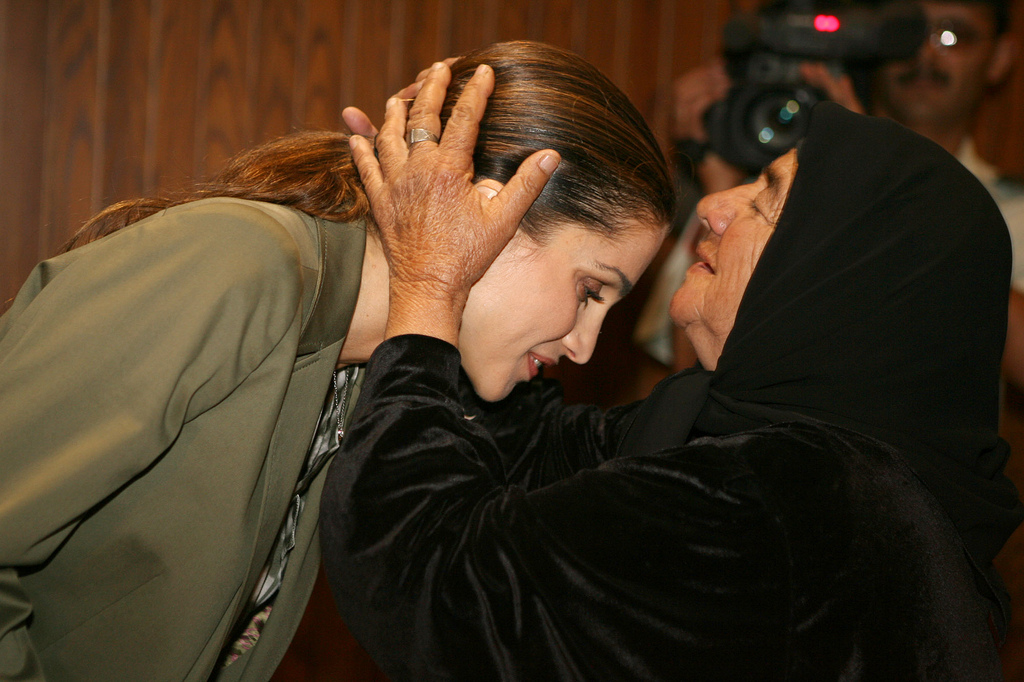 Looks on in delight as Mohammad and his mother are finally reunited after 25 years apart. The emotional reunion, which took place on Jordan Television's Al Forssah Program, was made possible due to Her Majesty's personal intervention.