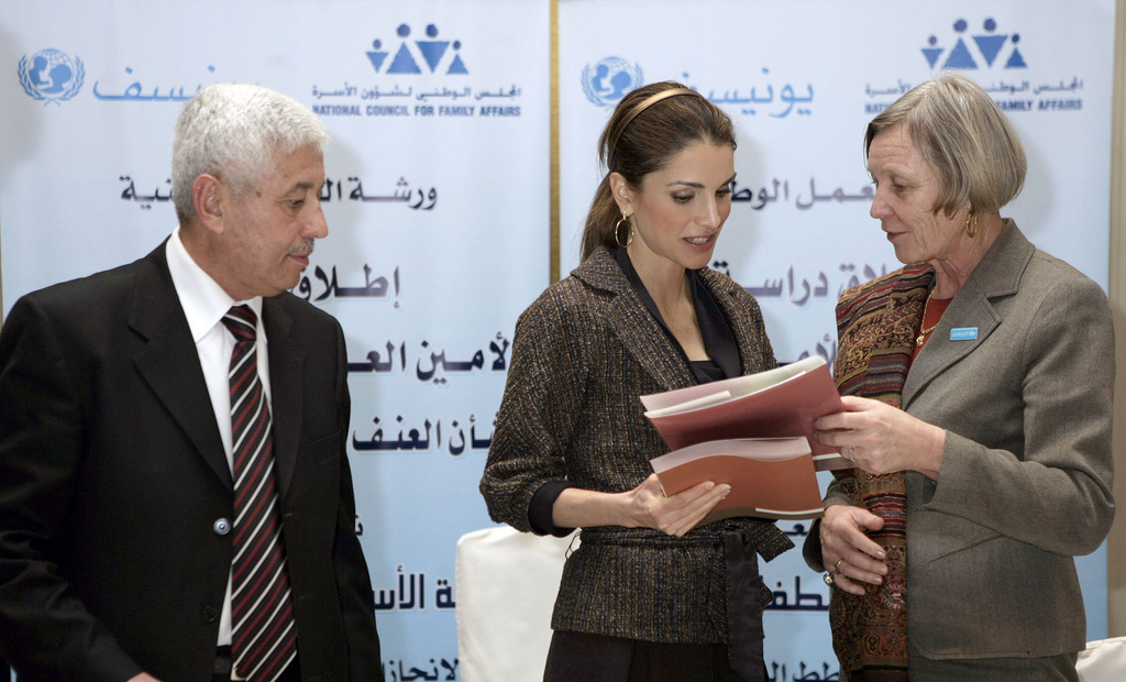 With National Council for Family Affairs Secretary-General, Dr. Jamil Smadi, and United Nations Children's Fund (UNICEF) Jordan Representative, upon receiving copies of the National Framework for Family Protection and the UN general secretary’s Study on Violence Against Children.