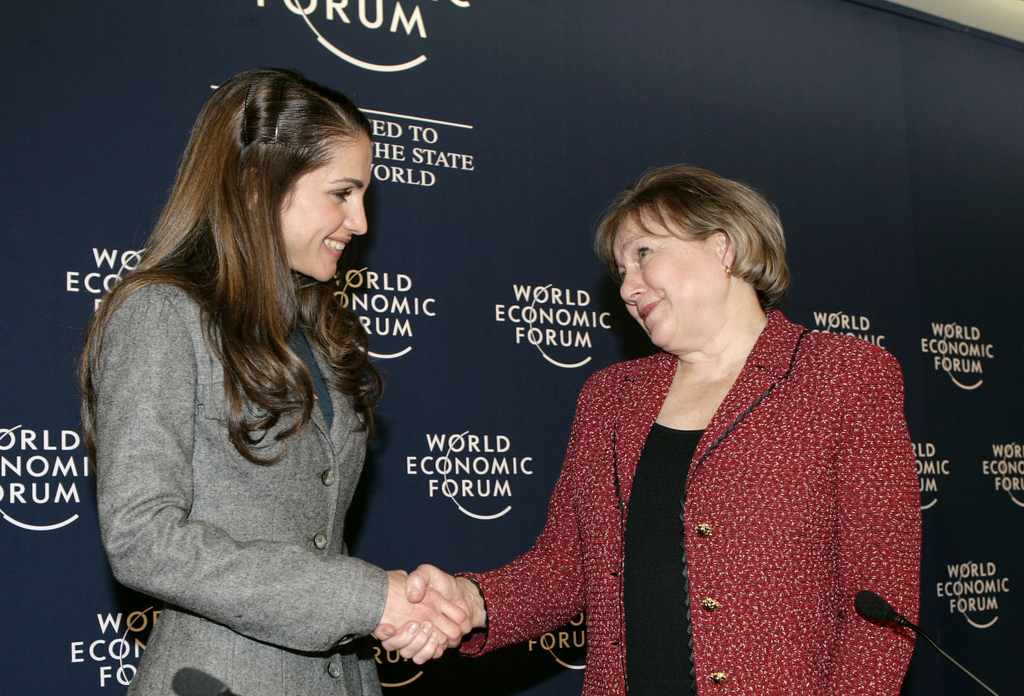 At the World Economic Forum, during a press conference where Her Majesty and UNICEF signed an agreement naming Queen Rania as UNICEF's first ever Eminent Advocate for Children. UNICEF Executive Director Ann Veneman signed the agreement with Queen Rania.