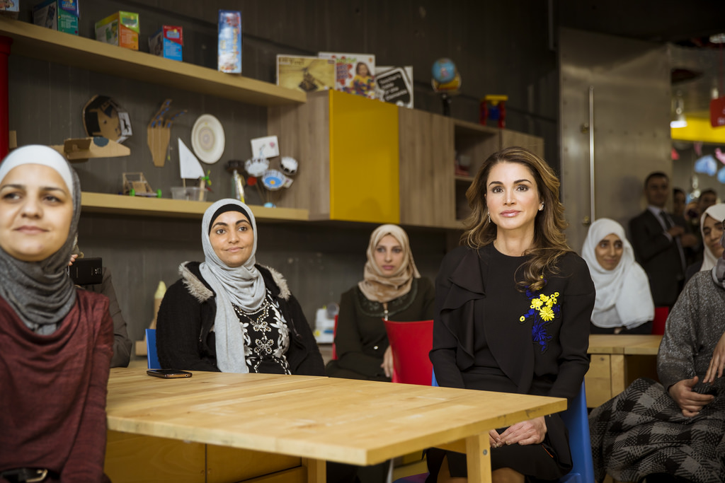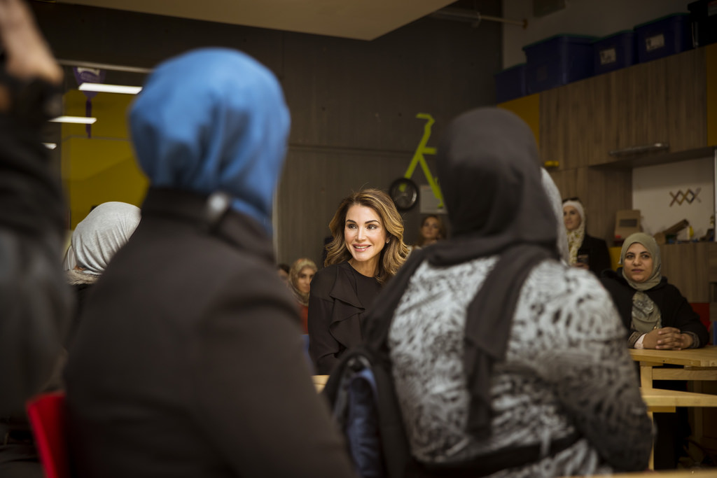 الملكة رانيا خلال لقاء مع سيدات أردنيات فاز مشروعهن التكنولوجي ضمن مشاركتهن في تجمع "النساء التكنولوجيات" الذي أقيم في سيليكون فالي في الولايات المتحدة الأمريكية الشهر الماضي