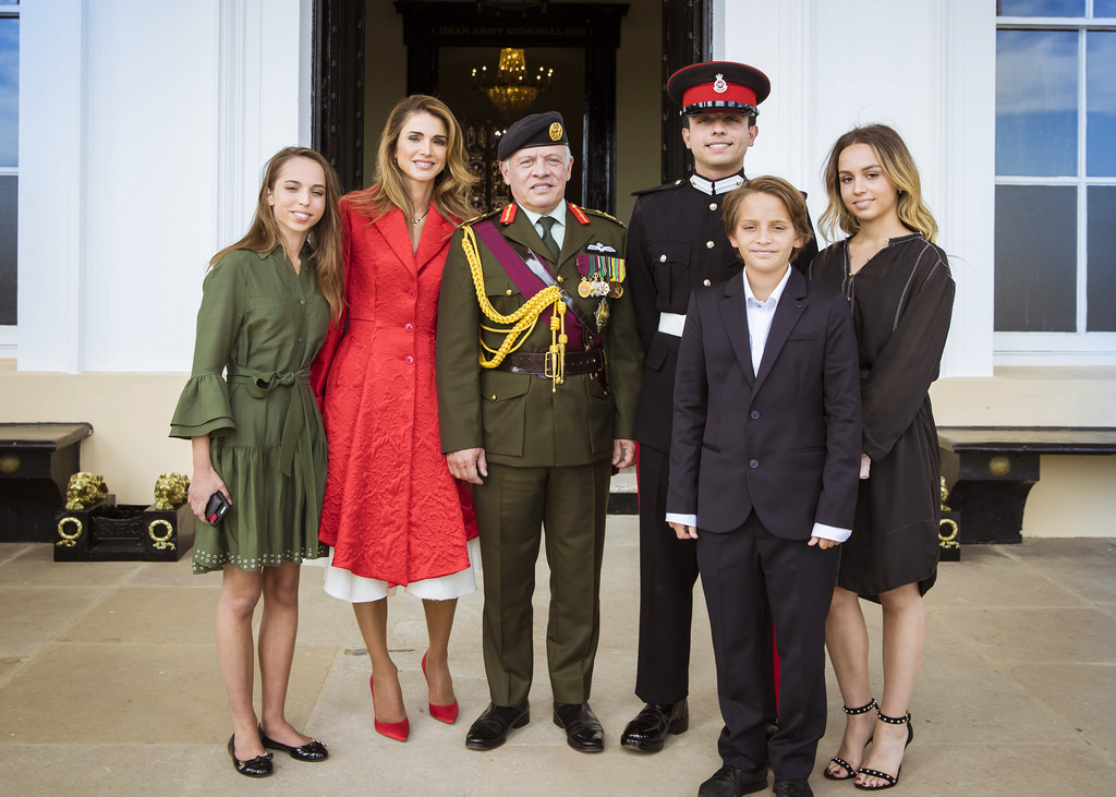 جلالتا الملك عبدالله الثاني والملكة رانيا العبدلله وسمو الأمير هاشم وسمو الأميرة إيمان وسمو الأميرة سلمى خلال حفل تخرج ولي العهد سمو الأمير الحسين من كلية ساندهيرست العسكرية