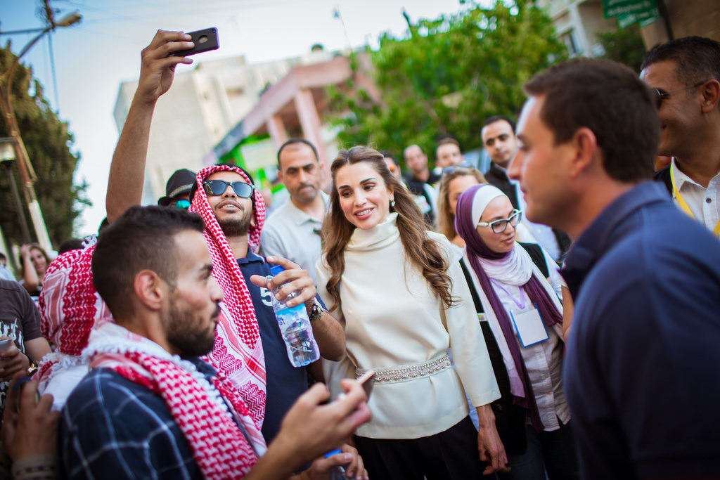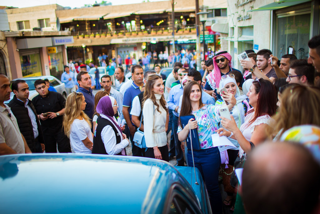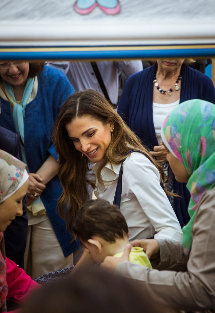 Her Majesty Queen Rania Al Abdullah with Her Royal Highness Princess Iman bint Abdullah during a walk around Rainbow St. with Out and About group