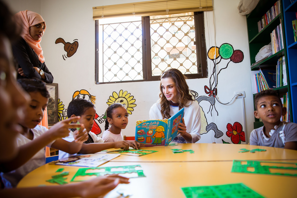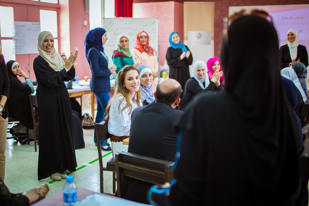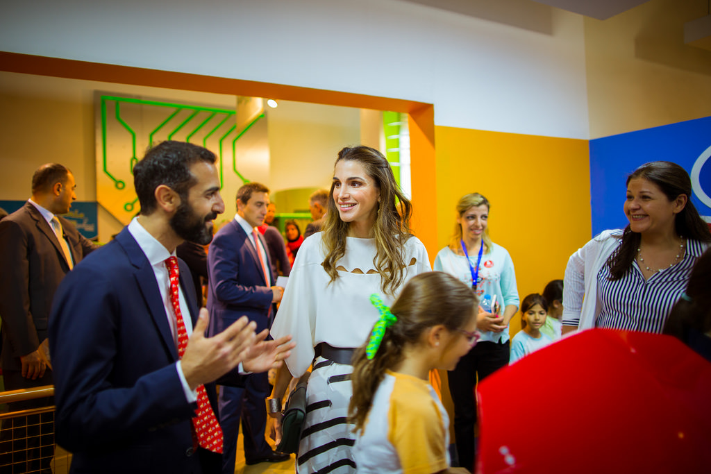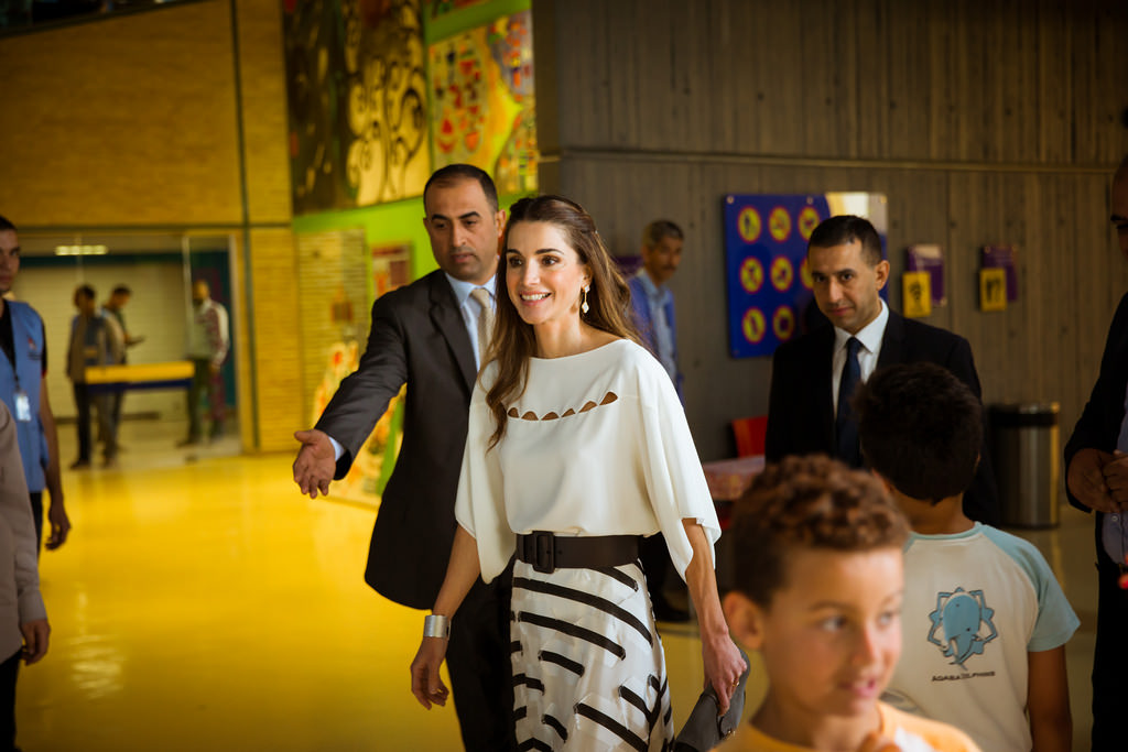 Her Majesty Queen Rania Al Abdullah during a visit to a training workshop organized by the QRTA at the Khawla Bint Al Azwar Secondary School for Gilrs.