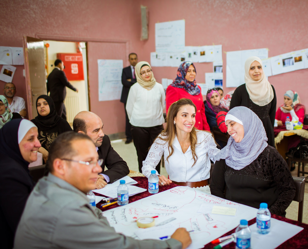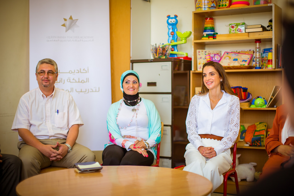 جلالة الملكة رانيا العبدالله خلال زيارتها الى مدرسة خولة بنت الأزور الثانوية الشاملة للبنات للاطلاع على ورشة تدريبة لأكاديمية الملكة رانيا لتدريب المعلمين.
