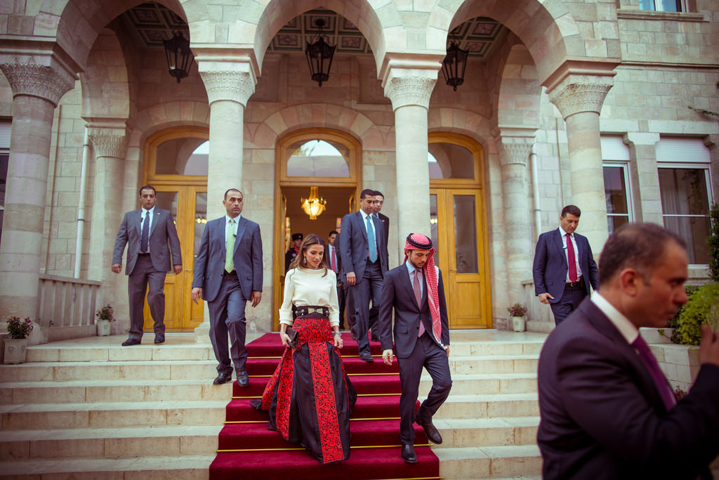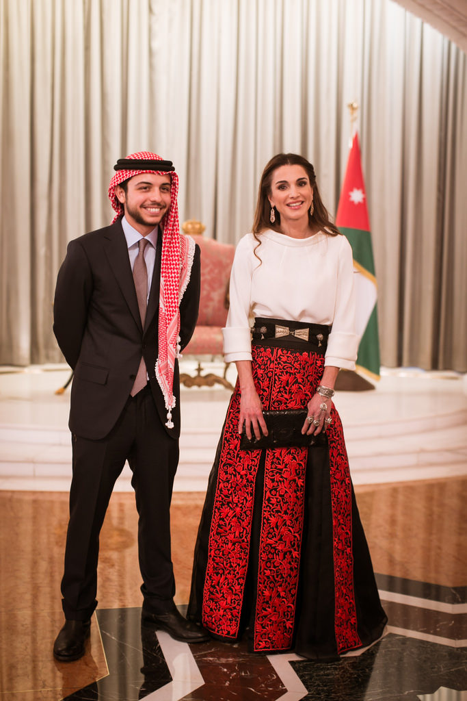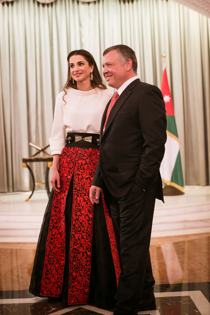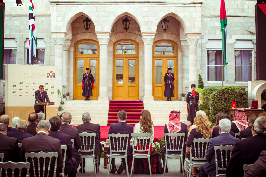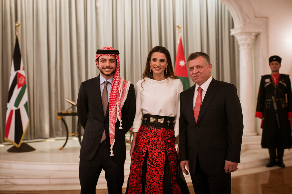 جلالة الملك عبدالله الثاني وجلالة الملكة رانيا العبدالله وسمو الأمير حسين ولي العهد خلال الاحتفال الرسمي بمناسبة عيد الاستقلال الـ ٦٩ في قصر رغدان العامر