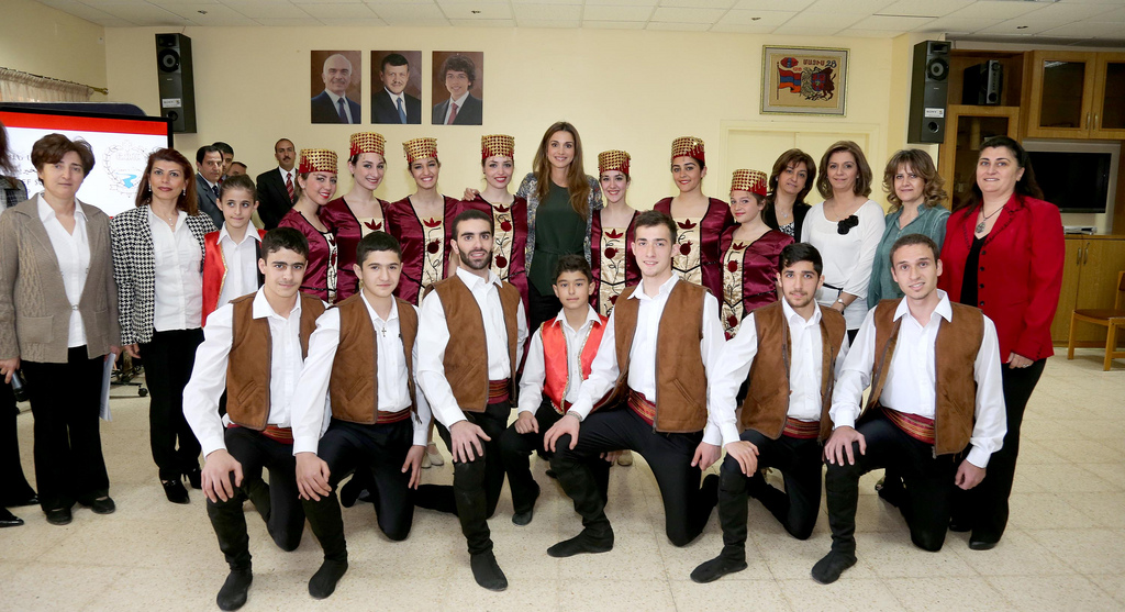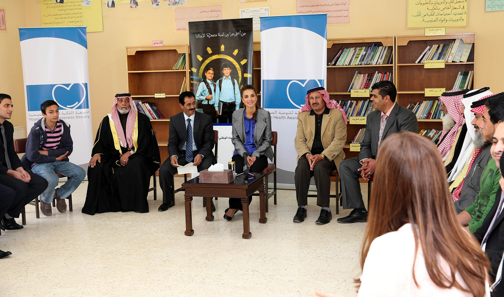 Her Majesty Queen Rania Al Abdullah meets with teachers, students, parents and local community leaders at Al Ma’mounieh Secondary School for Boys, the first boy's school in the Kingdom to receive the gold accreditation in the Healthy School Accreditation Program.
