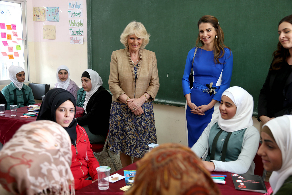 Her Majesty Queen Rania Al Abdullah, Camilla, the Duchess of Cornwall, and HRH Princess Wejdan Bint Fawaz on a visit to the Mahis Secondary School for Girls.