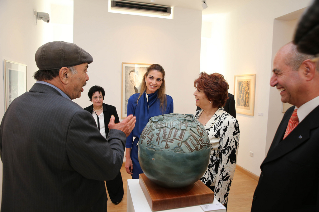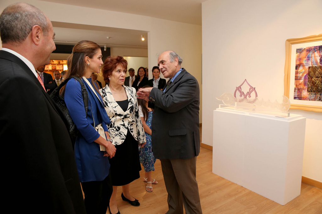 جلالة الملكة رانيا العبدالله ترافقها سمو الاميرة وجدان الهاشمي خلال افتتاح اكبر واشمل معرض فني اردني في المتحف الوطني الاردني للفنون الجميلة تحت عنوان "70 عاما من الفن الاردني المعاصر".