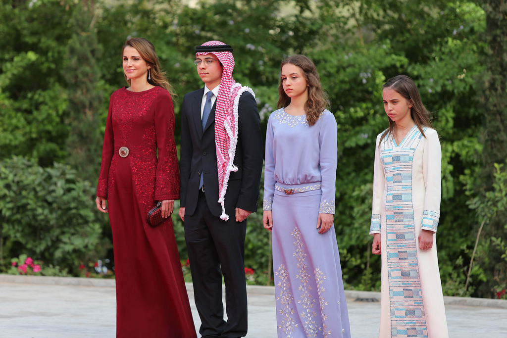 Her Majesty Queen Rania Al Abdullah, HRH Crown Prince Al Hussein Bin Abdullah, HRH Princess Iman, and HRH Princess Salma at a ceremony marking the Kingdom's 67th Independence Day.