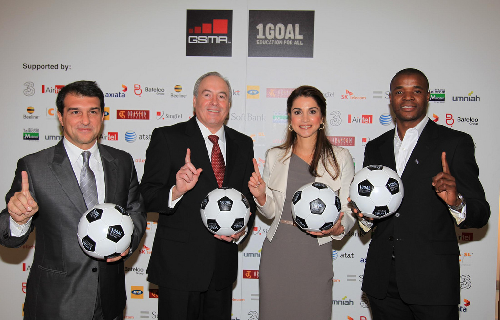 Joins football stars and CEO's from the mobile phone industry, who have signed up to 1GOAL, including Rob Conway, CEO of the GSMA, the President of FC Barcelona, Joan Laporta, and Aaron Mokoena, the South African team captain at the World Mobile Congress held in Barcelona.