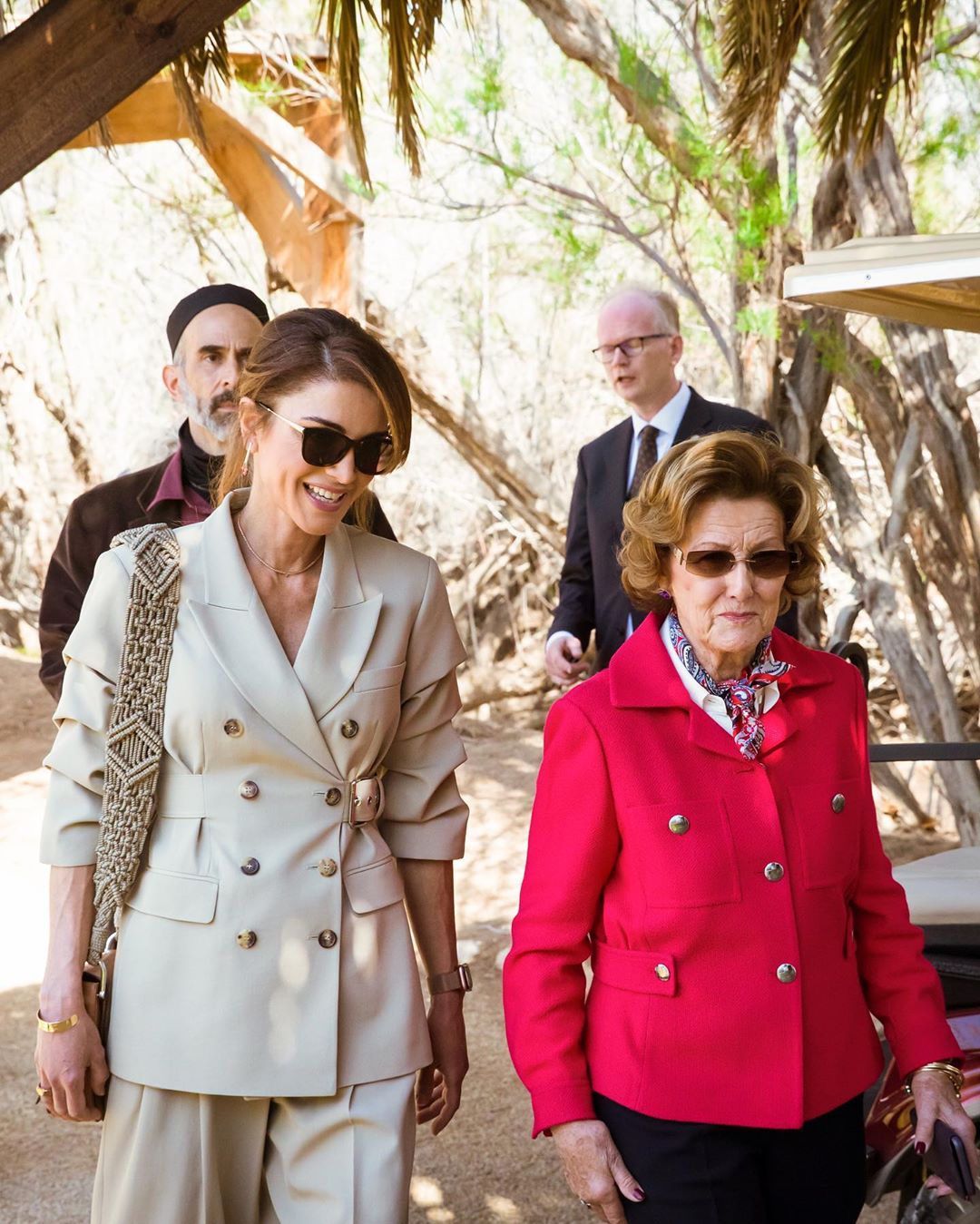 مع جلالة الملكة سونيا خلال مراسم الاستقبال الرسمي الذي أقيم لجلالة الملك هارالد الخامس ملك مملكة النرويج وجلالة الملكة سونيا في قصر الحسينية اليوم