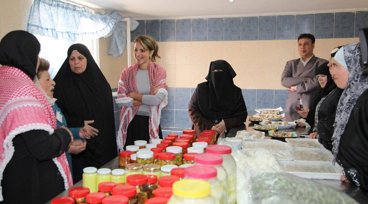 Her Majesty Queen Rania Al Abdullah checks the productive kitchen during her visit to the Society for Development and Rehabilitation of the Rural Woman.