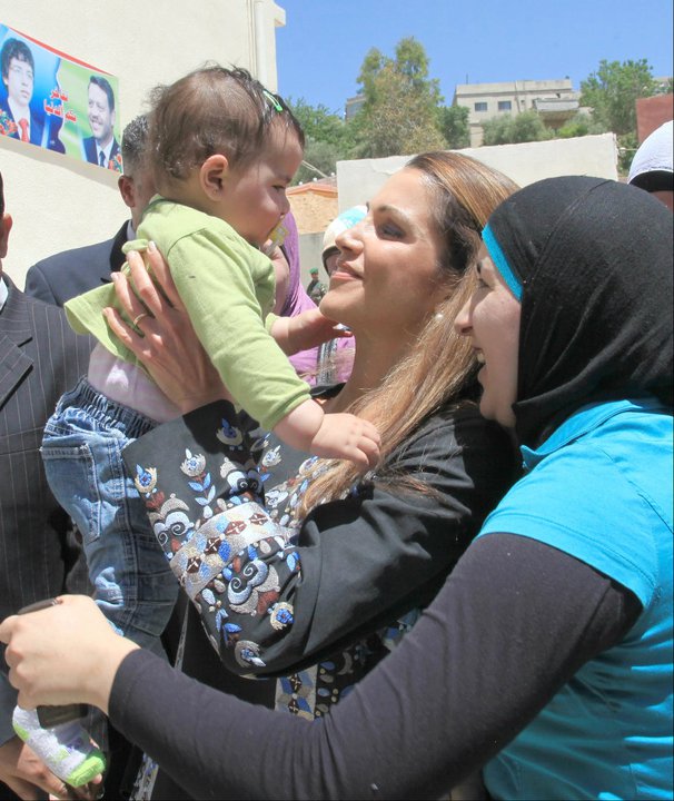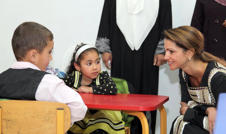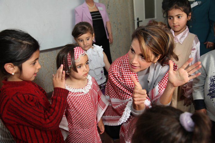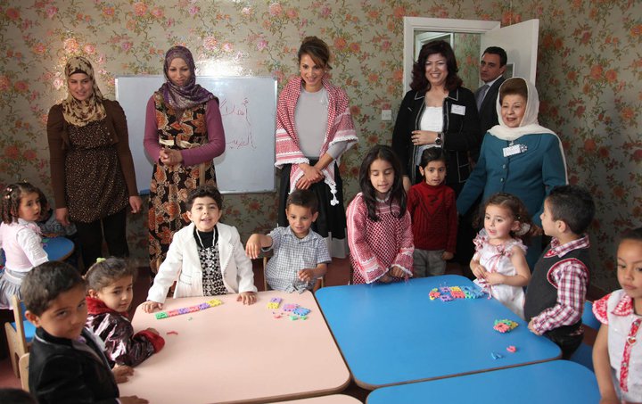 Her Majesty Queen Rania Al Abdullah at a kindergarten class during her visit to the Ruweished Association for Women