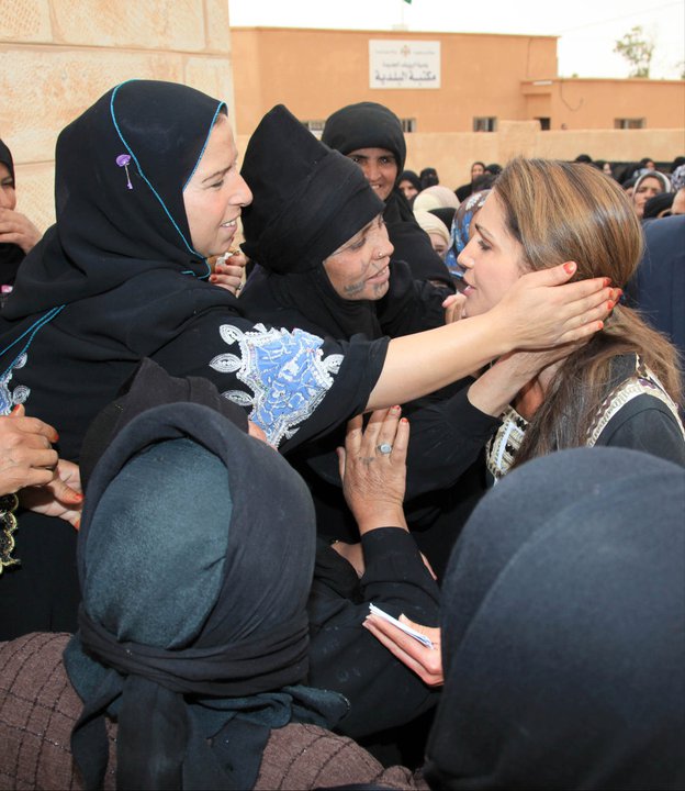 Her Majesty Queen Rania Al Abdullah talking to beneficiaries from the “Knowledge Station” during her visit to Al Ruweished area.
