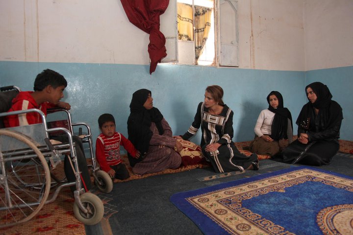 Her Majesty Queen Rania Al Abdullah checks on a family during her visit to Al Ruweished area.