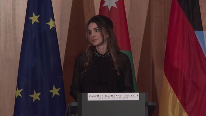 الملكة رانيا تلقي كلمة بعد تسلمها جائزة والتر راثيناو من المستشارة أنجيلا ميركل في برلين