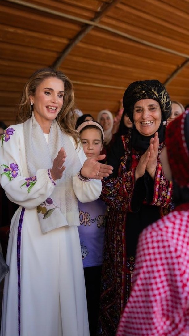 الملكة رانيا خلال زيارة إلى المطبخ الإنتاجي للسيدة فريال الكوفحي في منزلها في قرية حَور التابعة للواء قصبة اربد ولقاء عدد من سيدات القرية