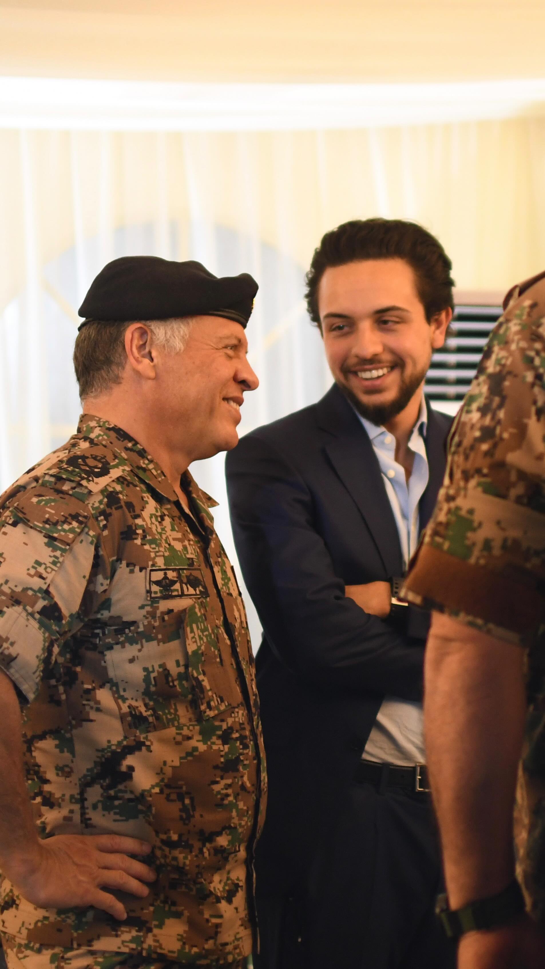 جلالة الملك عبدالله الثاني وجلالة الملكة رانيا العبدالله، وسمو الأمير الحسين بن عبدالله الثاني، ولي العهد، وسمو الأميرة إيمان بنت عبدالله الثاني والسيد جميل ترميوتس والأميرة سلمى بنت عبدالله الثاني خلال حفل تخريج الأمير هاشم بن عبدالله الثاني من مدرسة كينغز أكاديمي